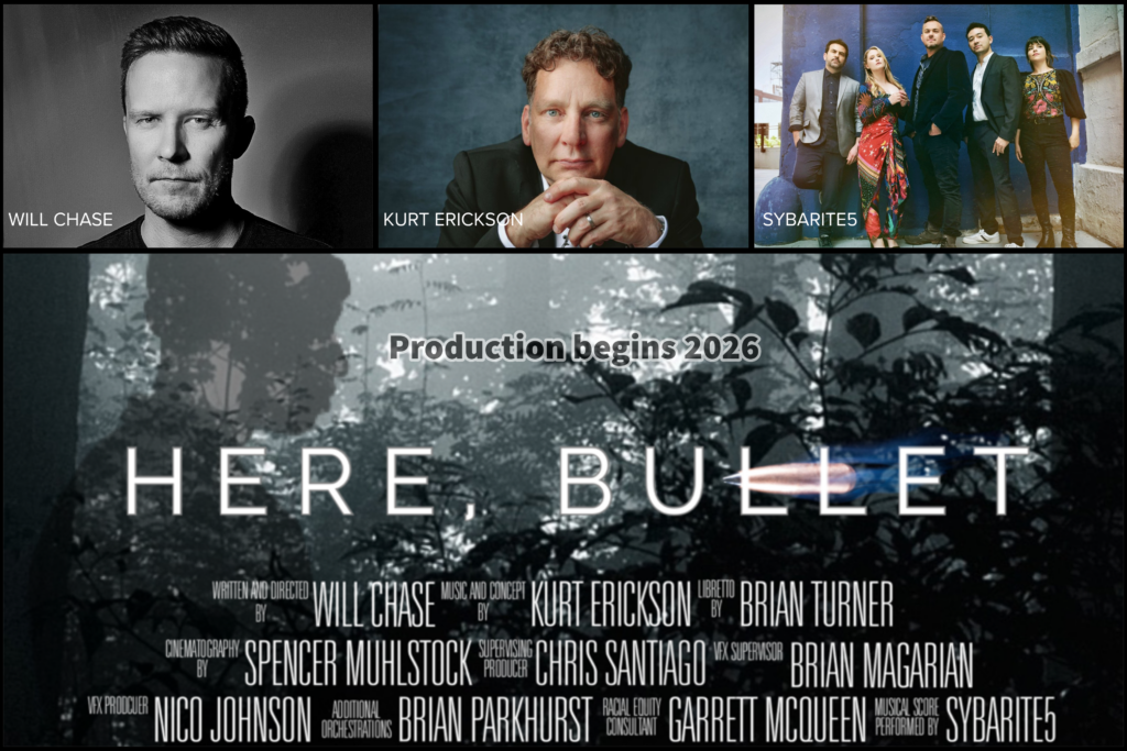 HERE, BULLET is a musical short film, currently in pre-production, by Tony Nominated, award-winning director and actor Will Chase, and Bay Area, prize-winning composer Kurt Erickson. Based on Erickson’s critically acclaimed, award-winning song cycle of the same name, HERE, BULLET is a singular moment frozen in time, a 5-minute surreal snapshot of a man confronting the bullet, the very death-harbinger that will enter his body and end his entire existence. Based on the award-winning poem by acclaimed poet, author, and Iraqi War veteran Brian Turner, HERE, BULLET takes this radically innovative poetry, and sets a scene of raw, visceral power, forcing its Hero to call out in a musical barrage of defiance, horror, and ultimate resignation.
